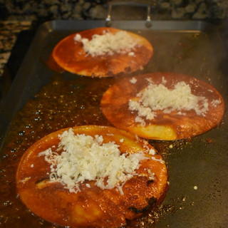 Time to bring this together. In griddle place a few tables of the infused oil and heat to medium. Dip a cold tortilla into the chili sauce and fry. Flip and add about 3 Tbs of cheese filling and 3 Tbs of potato and carrot mixture. Fold the tortilla over. Remove from griddle.