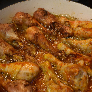 In a deep pan heat 1 cup of oil to medium. Pan fry the chicken until all sides are brown. Remove and place in a dish. Strain the oil. In the same dish add a couple tablespoon of that oil and slightly brown the carrots and potatoes or until they are completely cooked.